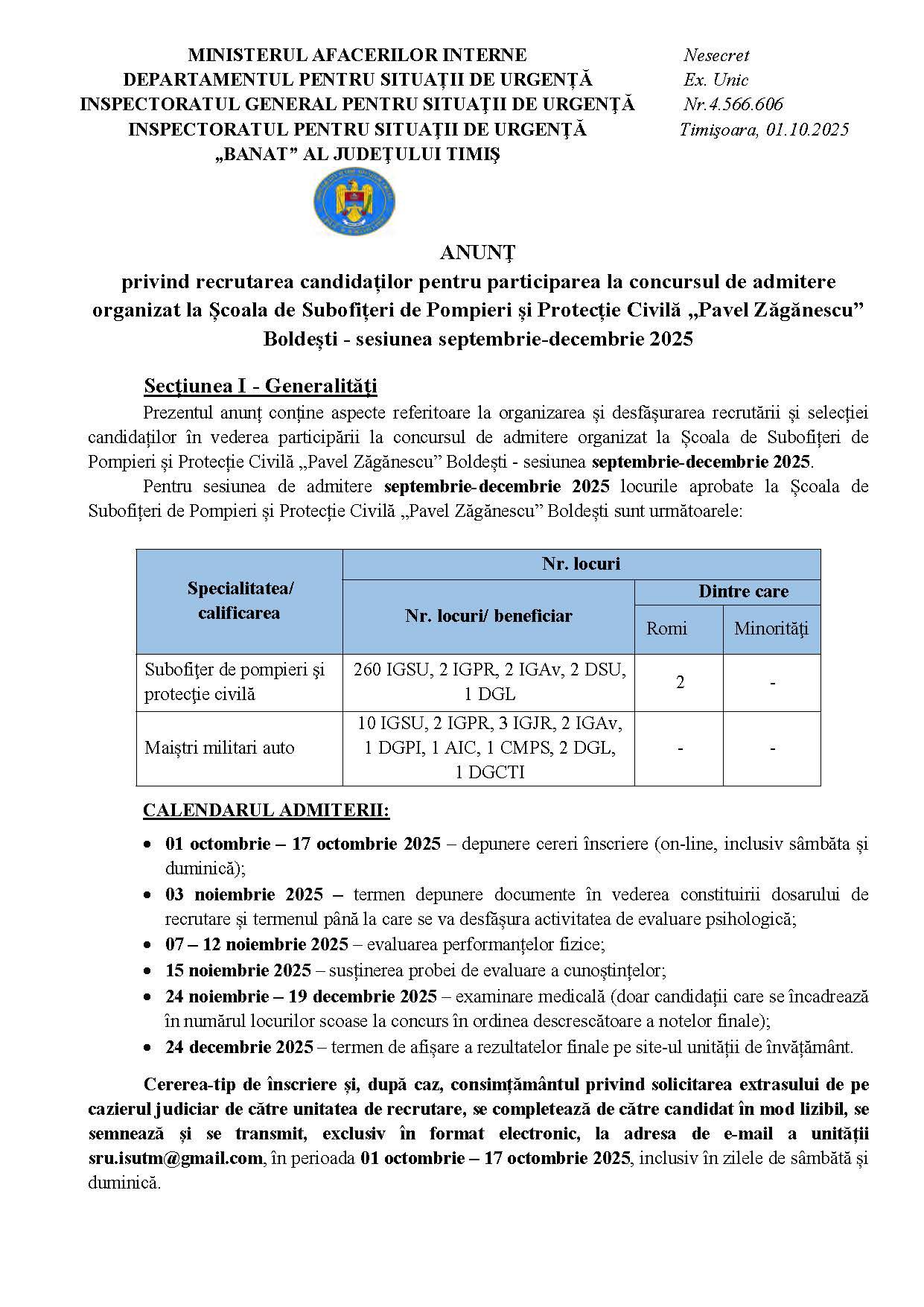 Anunț privind organizarea concursului de admitere la Școala de Subofițeri de pompieri și protecție civilă ,,Pavel Zaganescu’’ Boldesti.